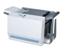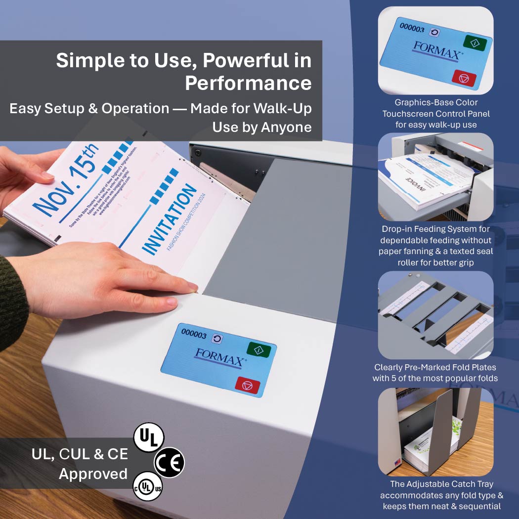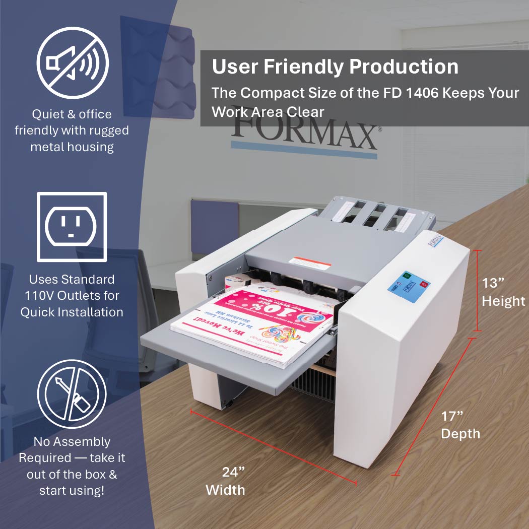Standard features include redesigned fold plates that are clearly marked and easier to adjust, a six-digit resettable counter, and drop-in top feed system, all in a compact and sleek desktop design. Fold plates are pre-marked for standard folds for 11” and 14” form sizes, and can be easily adjusted for custom folds.